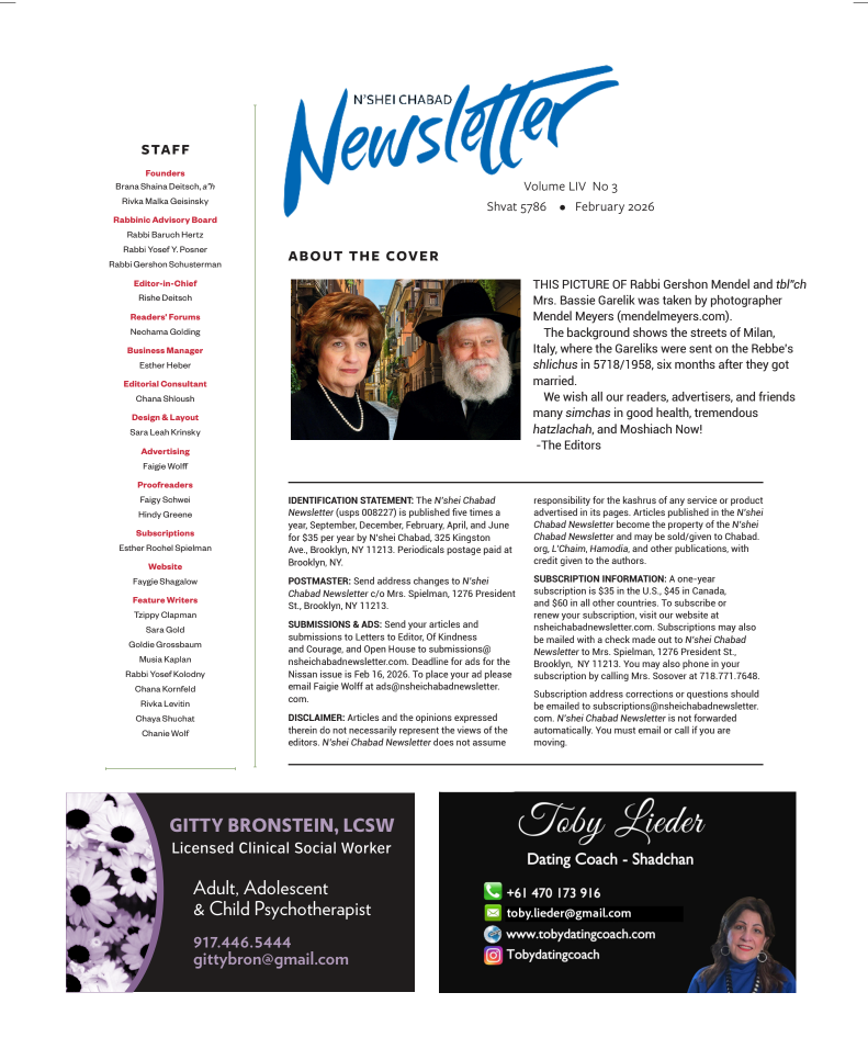 Cover Chof Beis Shvat 5786 Faygie Shagalow2026-02-11T20:55:51-05:00Cover NEW|Comments Off on Cover Chof Beis Shvat 5786 Share This Story! FacebookEmail Related Posts Kislev 5786 November 23rd, 2025 Tishrei 5786 November 4th, 2025 Tammuz 5785 June 13th, 2025 Nissan Cover March 21st, 2025 Chof Beis Shvat Cover February 7th, 2025